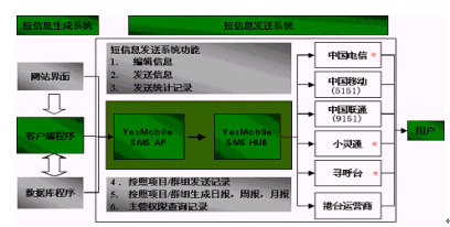 ·由YesMobile提供Api程序包,用戶(hù)按照技術(shù)規(guī)范開(kāi)發(fā)Web或客戶(hù)端程序完成接入,通過(guò)YesMobile的短信平臺(tái)向用戶(hù)指定客戶(hù)發(fā)送信息;