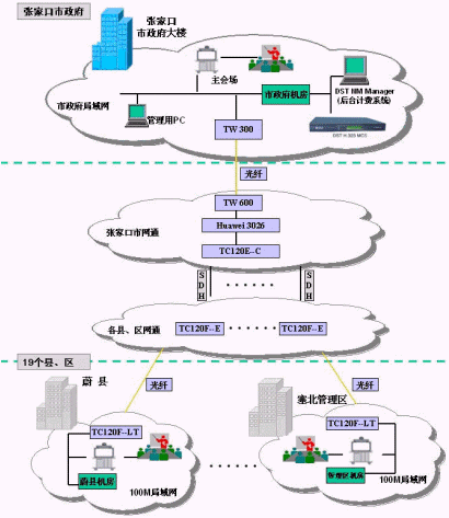 張家口市地處河北省與內(nèi)蒙古交界處,地域廣闊,如何實現(xiàn)方便、及時、快捷的溝通一直困擾著市政府。其下設(shè)的19個區(qū)縣的線路質(zhì)量參差不齊,整個網(wǎng)絡(luò)環(huán)境非常復(fù)雜。經(jīng)過一系列的商討,張家口政府成為了聯(lián)通公司第一位簽約用戶。
