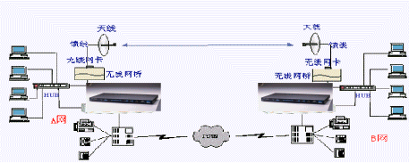 A網(wǎng)與B網(wǎng)分別為兩個局域網(wǎng),通過兩臺WavePoint II無線網(wǎng)橋?qū)蓚局域網(wǎng)連在一起,網(wǎng)橋上的RJ45口或BNC細纜接口與局域網(wǎng)相連。每臺網(wǎng)橋上插有一塊WaveLAN無線PC卡,PC卡的射頻輸出端口,通過饋線接到天線,通過PC卡來完成無線鏈路的連通。無線網(wǎng)橋連接完成后的效果類似HUB級連。IP語音網(wǎng)關(guān)-HGW-904的局域網(wǎng)接口(RJ45)連接到局域網(wǎng)的HUB上,根據(jù)用戶實際的話務(wù)量,選用Line端口接入用戶電話交換機(PBX),PBX接普通電話機和傳真機,并連接至電話公網(wǎng)(PSTN)。其中所需設(shè)備:HGW-904