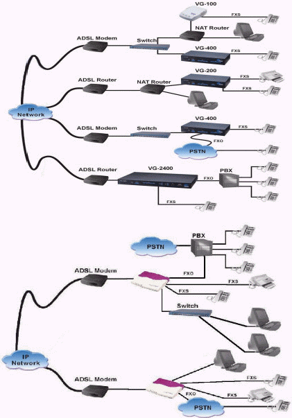 總部采用可堆疊的VG-2000,通過IP網(wǎng)絡(luò)(互聯(lián)網(wǎng))同各中心或分支機構(gòu)的相連,利用PBX(小型電話交換總機)的交換能力將話音自動轉(zhuǎn)到VG-2000上,通過數(shù)據(jù)專線、VPN或Internet傳輸?梢栽赩G-2000上進行流量控制(Bandwidth