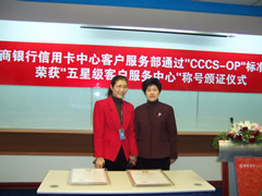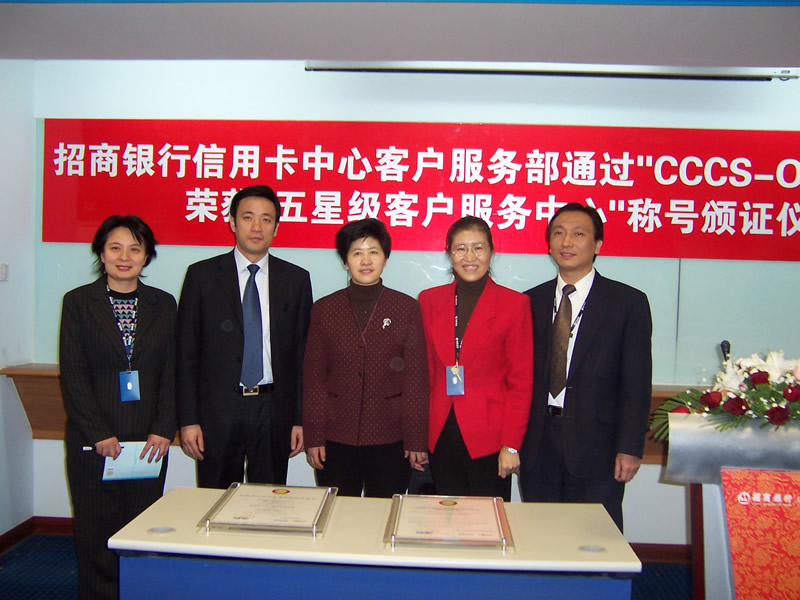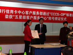 這天的上午10點(diǎn)30分,在招商銀行信用卡中心上?偛颗e行了簡(jiǎn)約而隆重的頒證儀式,信用卡中心常務(wù)副總經(jīng)理梁瑤蘭從信息產(chǎn)業(yè)部電子信息中心副主任、中國(guó)信息化推進(jìn)聯(lián)盟秘書長(zhǎng)劉獻(xiàn)軍手中接過證書,標(biāo)志著國(guó)內(nèi)第一家五星級(jí)客戶服務(wù)中心誕生了!