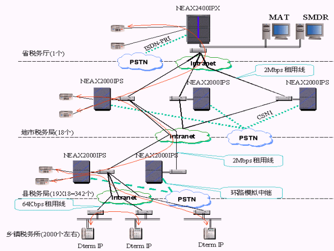 NEC公司為該省稅務提供了2003年全球同步推出的NEAX 2400及NEAX2000交換機系統(tǒng),為用戶提供了傳統(tǒng)時分交換系統(tǒng)和VoIP交換的完美結合,即具備VoIP功能又支持交換機的豐富功能,如豐富的終端,豐富的組網中繼和信令,語音信箱,多方會議,無線通信,統(tǒng)一計費等等。
