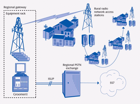 這里,每一本地-鄉(xiāng)村網(wǎng)絡(luò)里的"電話對(duì)"是通過(guò)Aculab公司的GroomerII與國(guó)內(nèi)電話網(wǎng)集成起來(lái)的。作為網(wǎng)絡(luò)的一個(gè)戰(zhàn)略要點(diǎn),GroomerII提供的E1鏈路可根據(jù)連接到的本地交換機(jī)的需要,運(yùn)行多種不同的協(xié)議,包括Q.931和ITU-T