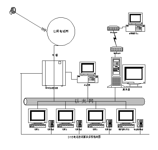 | ZQ-315電話投訴服務(wù)系統(tǒng)由如下各部分組成: 4呼叫排隊(duì)交換系統(tǒng) 4座席臺(tái) 4數(shù)據(jù)庫服務(wù)器 4系統(tǒng)維護(hù)管理臺(tái) 4同步數(shù)字錄音系統(tǒng) 4遠(yuǎn)程通訊模塊 4遠(yuǎn)程維護(hù)終端 各部分通過集線器和五類雙絞線組成快速以太網(wǎng);各節(jié)點(diǎn)之間采用TCPAP協(xié)議,以 Socket方式進(jìn)行通訊。其組成結(jié)構(gòu)如下圖所示。 ![]() 1.呼叫排隊(duì)交換系統(tǒng) 4與公用電話網(wǎng)相連,將來話分配到座席臺(tái)或遇忙排隊(duì) 4自動(dòng)應(yīng)答來話,完成自動(dòng)受理投訴與自動(dòng)查詢服務(wù) 4進(jìn)行呼叫轉(zhuǎn)移 2.座席臺(tái) 4人工應(yīng)答來話 4顯示主叫號(hào)碼、戶主與地址等信息(根據(jù)需要) 4計(jì)算機(jī)輔助投訴受理 4計(jì)算機(jī)輔助業(yè)務(wù)咨詢(法律。個(gè)案等) 3.?dāng)?shù)據(jù)庫服務(wù)器 4運(yùn)行網(wǎng)絡(luò)操作系統(tǒng) 4運(yùn)行數(shù)據(jù)庫系統(tǒng) 4提供各種數(shù)據(jù)服務(wù) 4對(duì)網(wǎng)絡(luò)安全性進(jìn)行檢查控制 4.系統(tǒng)維護(hù)管理臺(tái) 4對(duì)數(shù)據(jù)庫進(jìn)行維護(hù)管理 4查詢各種業(yè)務(wù)數(shù)據(jù),生成統(tǒng)計(jì)報(bào)表。 5.同步數(shù)字錄音系統(tǒng) 4將模擬話音轉(zhuǎn)換成數(shù)字信號(hào),并壓縮存儲(chǔ)。多路錄音,互不干擾 4支持多種語音數(shù)據(jù)壓縮格式(如PCMchDPCM、WAV等) 4播放放音 6.遠(yuǎn)程通訊模塊 4與上級(jí)或遠(yuǎn)程系統(tǒng)進(jìn)行通訊。 7.遠(yuǎn)程維護(hù)終端 4遠(yuǎn)程撥號(hào)登陸系統(tǒng),對(duì)系統(tǒng)進(jìn)行全面維護(hù) |