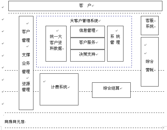電信大客戶管理系統(tǒng)是在收集大客戶市場調(diào)查信息、大客戶資料信息、大客戶經(jīng)營戰(zhàn)略資源的基礎上,自動采集專業(yè)計費、綜合營帳、客服、網(wǎng)管、財務等系統(tǒng)的相關數(shù)據(jù),實現(xiàn)快速、全面、準確的新客戶業(yè)務受理、新增需求受理及故障處理過程通道,實現(xiàn)完善的客戶經(jīng)理管理、代理商管理系統(tǒng),最終實現(xiàn)完整的大客戶滿意度評估體系和針對大客戶的個性化服務。建成后的系統(tǒng)從管理、服務、分析三方面出發(fā)主要應具備信息管理、客戶服務、決策支持功能。