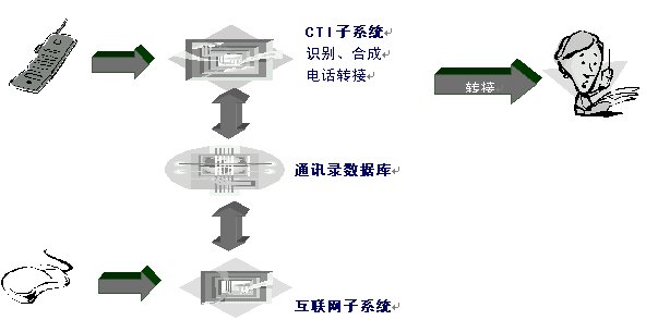 Internet子模塊相對比較簡單,可以采用目前主流的網絡通訊錄服務方式進行服務;而為了更好服務用戶,CTI子模塊需要采用先進的語音合成和語音識別技術。