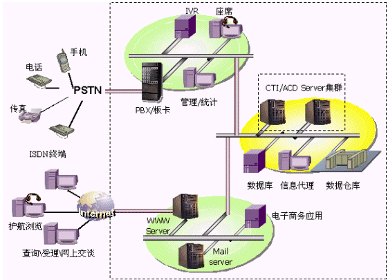 將PSTN訪問、Internet訪問有機(jī)結(jié)合,對(duì)傳統(tǒng)呼叫中心進(jìn)行擴(kuò)充,支持多種接入方式,多種交流渠道,具有傳統(tǒng)呼叫中心無法比擬的優(yōu)越性。