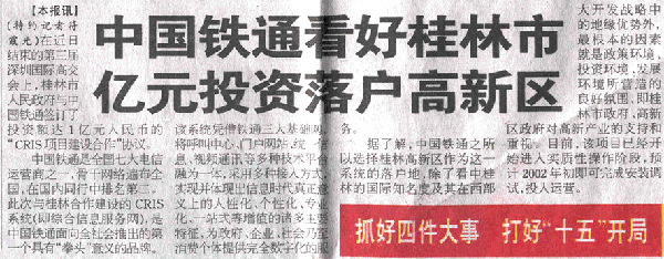 在此項目合作中,桂林市政府借助鐵通在電信市場上的綜合服務優(yōu)勢及佳訊飛鴻公司豐富的CALL CENTER系統(tǒng)集成經(jīng)驗,以高起點、大規(guī)劃的指導思想,建立以綜合信息服務、電子政務、企業(yè)客戶服務、旅游服務、電子教育服務和電子商務服務為核心的城市信息化交互平臺。根據(jù)該協(xié)議,鐵通網(wǎng)絡公司將投資1億元人民幣分階段建設桂林城市信息化標志性工程CRIS,一期投資建設100個座席。建成后的CRIS系統(tǒng)平臺,幫助桂林市對現(xiàn)有的各信息網(wǎng)數(shù)據(jù)加以全面整合、優(yōu)化,真正實現(xiàn)“多網(wǎng)合一”和信息的智能化、人性化。為旅游業(yè)、信息產(chǎn)業(yè)、高新產(chǎn)業(yè)、會展經(jīng)濟、招商引資和政府信息化等各個方面,提供最佳的、全方位的、高品質(zhì)的綜合信息服務,全面帶動桂林市的經(jīng)濟發(fā)展。
