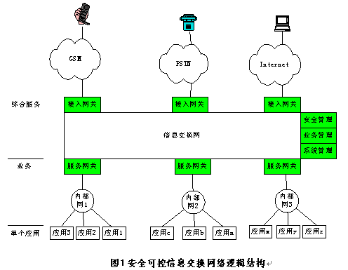 整個安全可控信息交換網(wǎng)系統(tǒng)由三個邏輯部分組成:網(wǎng)關、信息交換網(wǎng)、管理。接入網(wǎng)關連接各種公共服務網(wǎng),包括Internet網(wǎng)、GSM、PSTN、CATV等,它將不同公共服務網(wǎng)的通信協(xié)議轉換成統(tǒng)一的信息交換網(wǎng)的XML協(xié)議。