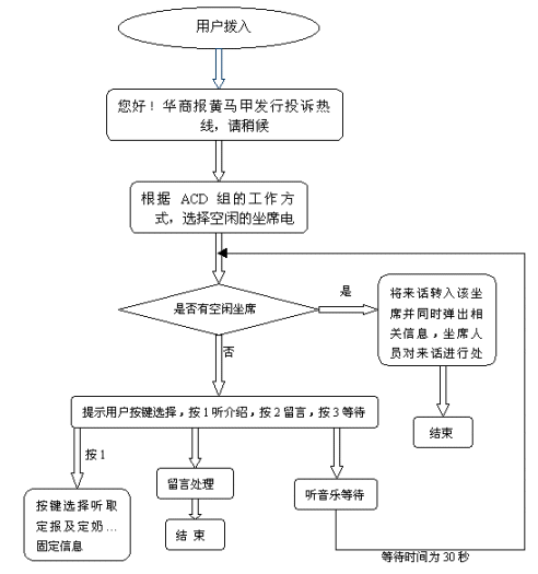 當坐席全忙時,IVR流程會引導(dǎo)用戶按鍵選擇聽取介紹、留言及聽音樂等待,用戶可按鍵選擇聽取介紹(包括定報及定奶的信息),聽完介紹用戶可按鍵選擇繼續(xù)聽介紹或轉(zhuǎn)人工服務(wù);用戶選擇留言時,IVR流程會提示用戶留下電話及投訴內(nèi)容,有指定的坐席人員每天聽取留言并進行處理,從而減少了由于話務(wù)量集中而坐席人員無法及時處理的投訴電話。用戶選擇等待時會聽到一段優(yōu)美的音樂,當坐席有空閑時電話會被及時的轉(zhuǎn)入坐席由坐席人員進行處理。