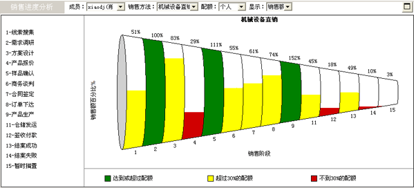 如果缺乏可預(yù)見的銷售進(jìn)程管理,企業(yè)的銷售目標(biāo)將難以順利實(shí)現(xiàn);手工的、基于結(jié)案的銷售收入統(tǒng)計(jì)造成的滯后性,降低了企業(yè)靈活應(yīng)對(duì)復(fù)雜多變市場的能力。幸好,CRM軟件提供了一套經(jīng)典的銷售進(jìn)程可視化管理工具,它包括銷售管道圖和銷售預(yù)測(cè)圖等。