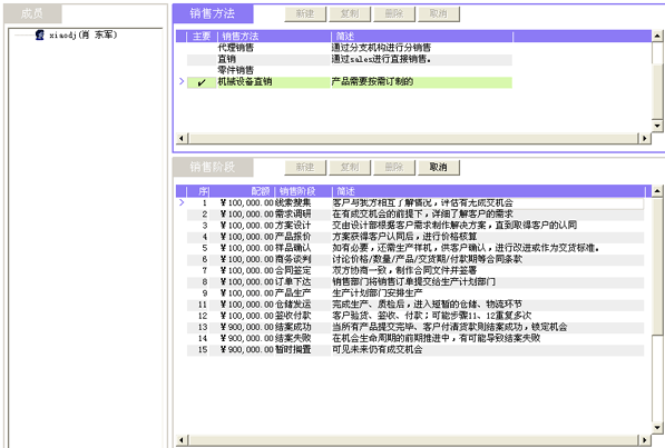 一套好的CRM軟件,應(yīng)當(dāng)同時(shí)支持多種銷售方法。例如,精密機(jī)械制造行業(yè),有可能同時(shí)需要支持四種銷售方法:標(biāo)準(zhǔn)整機(jī)銷售方法、項(xiàng)目型整機(jī)銷售方法、零件及有償服務(wù)銷售方法、三包件等。每個(gè)銷售方法都有對(duì)應(yīng)的銷售流程。以圖2為例,我們看到"機(jī)械設(shè)備直銷"的銷售方法,對(duì)應(yīng)著15個(gè)銷售階段,每個(gè)階段都可通過簡述來明確該階段典型的業(yè)務(wù)特征、成交可能性的區(qū)間,以便銷售代表在操作記錄的時(shí)候擁有共識(shí)。