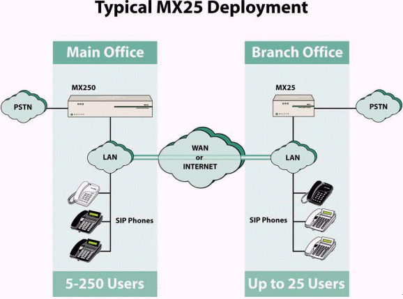 當(dāng)與MX250一起使用時, MX25提供了一種既能將MX250的功能擴展至分支機構(gòu),同時又可確保該分支機構(gòu)與PSTN有效連接的低成本的解決方案。遠(yuǎn)程機構(gòu)的工作人員同樣可以使用語音信箱、自動話務(wù)員、在線狀態(tài)和即時消息等功能。如同在總部工作一樣這些遠(yuǎn)程機構(gòu)的工作人員可以與企業(yè)內(nèi)部任意其它地點的人員進行溝通,也可以擔(dān)當(dāng)接線員或ACD(自動話務(wù)分配)組成員的工作。