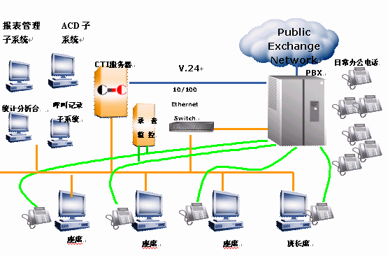 系統(tǒng)采用PBX提供完備的呼叫控制功能,能夠滿足呼叫中心電話應(yīng)用的需要,實現(xiàn)呼入、呼出等各種電話控制功能;還需要提供自動呼叫分配ACD系統(tǒng),呼叫管理系統(tǒng),用于有效管理所有話務(wù);同時,PBX具有CTILink接口,可實現(xiàn)與計算機系統(tǒng)的連接。