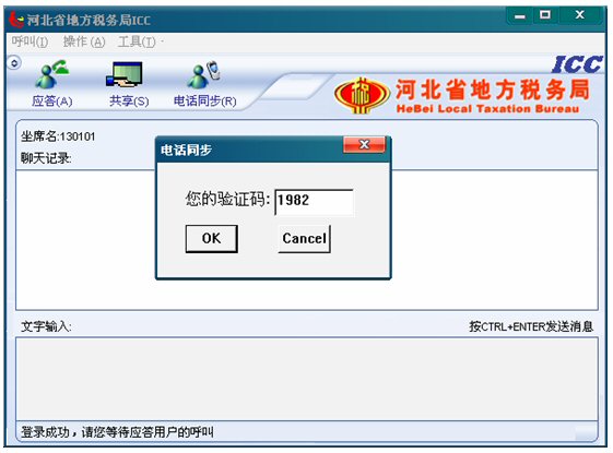 坐席只需通過電話將此框中的驗證碼(比如圖例中的1982驗證碼)告訴和坐席通話的納稅人。然后點(diǎn)擊OK按鈕。納稅人端得到坐席告訴他的驗證碼后,納稅人端也有個電話同步按鈕,納稅人點(diǎn)擊并輸入坐席告訴他的驗證碼后,坐席就可以看到有呼叫進(jìn)來。此呼叫就是正和坐席通話納稅人的ICC呼叫。坐席點(diǎn)擊應(yīng)答后就可以和此納稅人ICC