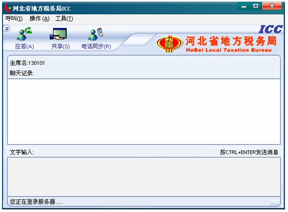 2. 點(diǎn)擊12366界面下面一行按鈕中的ICC按鈕,運(yùn)行起來ICC。出現(xiàn)ICC界面,此時ICC處于登錄服務(wù)器狀態(tài),左下角的狀態(tài)欄有文字提示“您正在登錄服務(wù)器……”。聊天記錄對話框的上面有坐席名,例如“坐席名:130101”如下圖:
