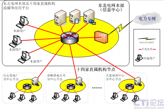 針對東北電網(wǎng)有限公司的需求,系統(tǒng)采用分布式網(wǎng)絡(luò)結(jié)構(gòu),并在14個(gè)直屬分支機(jī)構(gòu)部署CDN分節(jié)點(diǎn),中心機(jī)房架設(shè)一臺WEB服務(wù)器,1臺數(shù)據(jù)庫服務(wù)器,1臺流媒體服務(wù)器作為CDN中心服務(wù)器,1臺直播發(fā)布服務(wù)器、2臺直播采集工作站,14個(gè)分支機(jī)構(gòu)分別架設(shè)1臺流媒體服務(wù)器作為CDN邊緣服務(wù)器,具體配置如下: