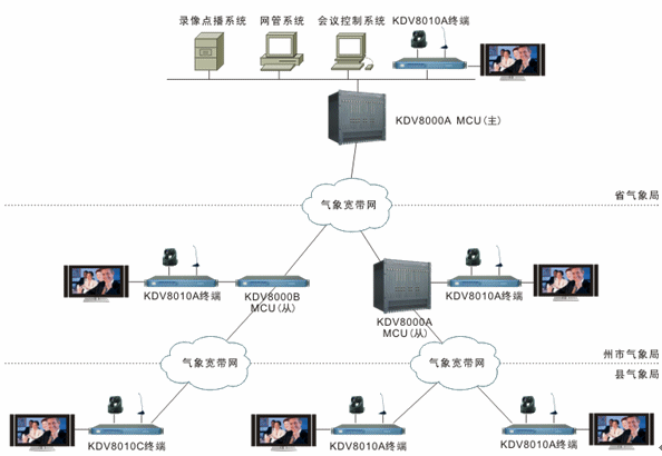整個(gè)系統(tǒng)依托云南省氣象局自建的寬帶IP網(wǎng)絡(luò)進(jìn)行搭建。省氣象局與各州市氣象局的網(wǎng)絡(luò)連接可為視頻會(huì)議提供2M通信帶寬。各州市氣象局與各縣級(jí)氣象局的網(wǎng)絡(luò)連接可為視頻會(huì)議提供768K通信帶寬。整個(gè)系統(tǒng)采用MCU兩級(jí)級(jí)聯(lián)組網(wǎng)。