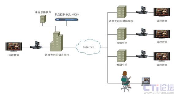 中澳遠(yuǎn)程教育系統(tǒng)采用科達(dá)KDV8000C多點(diǎn)控制單元(MCU)1臺(tái)和課程錄播軟件1套安裝在西澳大利亞語(yǔ)言學(xué)院,4臺(tái)TS6610視頻會(huì)議終端,分別安裝在西澳語(yǔ)言學(xué)院、堪林學(xué)院、常州中學(xué)和淮陰中學(xué)的遠(yuǎn)程教室。此外,考慮到遠(yuǎn)程授課的實(shí)際應(yīng)用需求,系統(tǒng)還提供了無(wú)線(xiàn)麥克接入方案。系統(tǒng)部署拓?fù)鋱D見(jiàn)下圖。