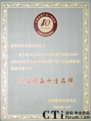 CTI論壇(ctiforum)12月14日消息(記者 張塵):2009年12月4日,由國內(nèi)教育權(quán)威機構(gòu)“中國教育技術(shù)協(xié)會”主辦,以讀者調(diào)查問卷的形式舉行的第五屆全國電教產(chǎn)品十佳品牌頒獎典禮在福州梅峰賓館盛大開幕,科達教育視頻會議產(chǎn)品憑借卓越的產(chǎn)品性能和良好的客戶服務(wù)入選網(wǎng)絡(luò)產(chǎn)品類十佳之列,同時也成為首個入選十佳品牌的視頻會議產(chǎn)品。