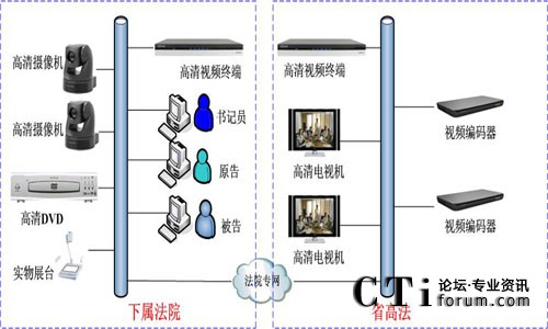 系統(tǒng)覆蓋省高院法庭、8個地市中院法庭和58個基層法庭。系統(tǒng)利用法院專用IP傳輸網(wǎng)絡,以省高院各法庭為一級中心,地市中院為分控中心,基層法院為末端接入。在省高院中心、地市中院和基層分院設立遠程數(shù)字庭審中心,配置庭審視頻終端、專用攝像機和麥克風,實現(xiàn)圖像傳輸和遠程通信。