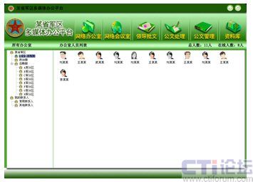 如圖所示的畫(huà)面即為網(wǎng)動(dòng)協(xié)同辦公系統(tǒng)的基礎(chǔ)工具——協(xié)同通訊系統(tǒng),該系統(tǒng)可將部隊(duì)機(jī)構(gòu)內(nèi)的所有部門、人員按照實(shí)際的組織結(jié)構(gòu)列出,應(yīng)用該系統(tǒng)的人員通過(guò)點(diǎn)擊其他在線人員,從而有選擇性的與對(duì)方進(jìn)行語(yǔ)音、視頻、數(shù)據(jù)共享、點(diǎn)對(duì)點(diǎn)會(huì)議等各種操作,將以往“看不見(jiàn)”的對(duì)話變?yōu)椤懊鎸?duì)面”的交流。相比于傳統(tǒng)的電話溝通而言,它不僅更暢通快捷,更可以最大化的降低溝通成本。另外,數(shù)據(jù)共享功能還可以將軍隊(duì)里需共同探討的話題,如作戰(zhàn)地圖動(dòng)態(tài)研究、工作報(bào)告資料等實(shí)時(shí)顯示在數(shù)據(jù)區(qū)中,雙方通過(guò)電腦即可進(jìn)行遠(yuǎn)程的話題討論、圈點(diǎn)批注。