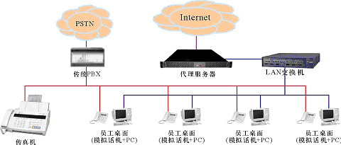 。。某中小企業(yè),無分支機構,現(xiàn)時有一個由傳統(tǒng)PBX構建的電話系統(tǒng)和一個以太局域網(wǎng),兩者相互獨立,局域網(wǎng)通過一臺代理服務器用以太網(wǎng)或ADSL方式接入Internet。企業(yè)的語音通信由電話系統(tǒng)實現(xiàn);員工的日常工作需要使用計算機以及多種局域網(wǎng)和Internet服務(如文件共享、網(wǎng)絡打印、瀏覽網(wǎng)頁、收發(fā)郵件等),這些服務通過局域網(wǎng)提供,目前,在企業(yè)的經營管理上還沒有應用相關的業(yè)務系統(tǒng)(如工作流、ERP、CRM等)。