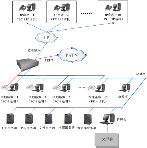 RT-CCP1000還有100M以太網(wǎng)接口,通過這個(gè)接口可以把RT-CCP1000連接到Internet上。每個(gè)IP座席配備VOIP終端(IP電話、軟電話或IAD)和電腦各一臺(tái),VOIP終端把Proxy地址指向RT-CCP1000,電腦上安裝座席客戶端軟件,都通過Internet接入中心系統(tǒng)。