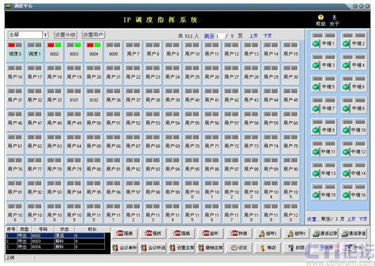 在此界面中實現(xiàn)了配置管理功能和呼叫相關(guān)功能。配置管理分為:設(shè)置、修改和刪除分組,設(shè)置用戶,設(shè)置中繼,翻頁等功能;呼叫相關(guān)功能:強接、強拆、強插、監(jiān)聽、轉(zhuǎn)接、組呼、設(shè)定等級、設(shè)定權(quán)限、設(shè)定夜服、會議相關(guān)等功能。另外,可以在本軟調(diào)度系統(tǒng)中檢索瀏覽相關(guān)通話記錄,并可對錄音進行回放。