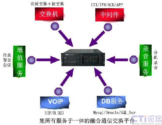 融天科技多媒體呼叫中心采用國(guó)際領(lǐng)先技術(shù)的融合通信一體化平臺(tái),該平臺(tái)集傳統(tǒng)PBX、IP-PBX于一體,集CTI、IVR、ACD、APP等服務(wù)功能于一體,集錄音、傳真、會(huì)議、留言等全套的增值業(yè)務(wù)于一體,硬件平臺(tái)非常簡(jiǎn)單,用戶只需要購(gòu)買一臺(tái)硬件設(shè)備即可:
