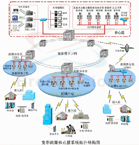 - 寬帶流媒體運(yùn)營管理支撐系統(tǒng),包括點(diǎn)播內(nèi)容的采集、管理、內(nèi)容分發(fā)、負(fù)載均衡、計費(fèi)等功能模塊;