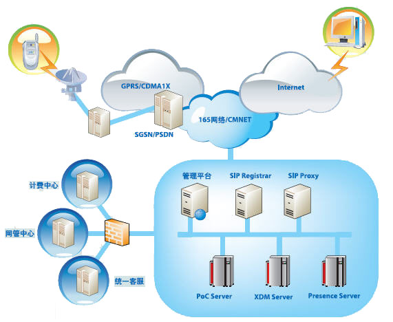 POC(Push-to-talk Over Cellular)是基于蜂窩移動通信網絡的PTT(Push To Talk)業(yè)務。POC通過半雙工VoIP技術來實現PTT,利用GPRS或CDMA1X等網絡“永遠在線”的優(yōu)勢,節(jié)省運營成本,同時為傳統移動用戶提供全新的業(yè)務形式。在支持GPRS/CDMA1X網絡的同時,東信北郵手機一鍵通平臺系統亦支持IMS網絡。