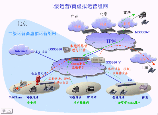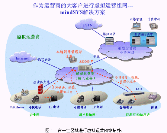 對(duì)于希望投資低啟動(dòng)快的虛擬運(yùn)營(yíng)商,我們?cè)O(shè)計(jì)了mindSYS解決方案。在mindSYS解決方案中,以SS3000-V作為核心的呼叫控制、業(yè)務(wù)管理和計(jì)費(fèi)平臺(tái),配合中繼網(wǎng)關(guān)MG3000-T以及眾多的接入終端,組成一個(gè)完整的解決方案。該方案可以滿足虛擬運(yùn)營(yíng)商的初期業(yè)務(wù)發(fā)展,有強(qiáng)大的組網(wǎng)適應(yīng)性和良好的管理計(jì)費(fèi)功能,并具備極好的可擴(kuò)展性,可以根據(jù)用戶的業(yè)務(wù)發(fā)展,平滑升級(jí)到更強(qiáng)大的增值業(yè)務(wù)、運(yùn)營(yíng)管理計(jì)費(fèi)平臺(tái)--OpenSP-K平臺(tái),無(wú)縫過(guò)渡到完善的大規(guī)模虛擬運(yùn)營(yíng)解決方案。