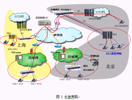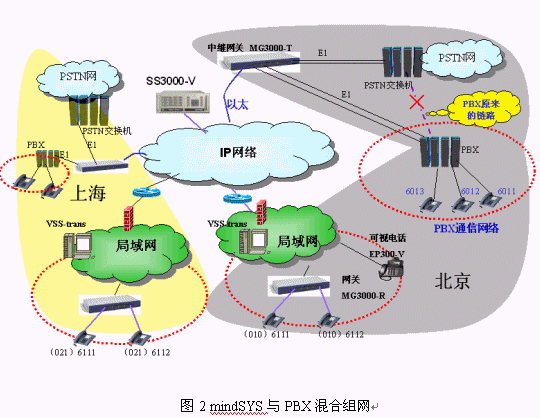 我們建設(shè)mindSYS系統(tǒng)的時(shí)候基本上不改變?cè)瓉鞵BX的布線和配置,PBX原來的數(shù)字中繼直接連接到運(yùn)營商的程控交換機(jī),我們現(xiàn)在只是將PBX的數(shù)字中繼連接到中繼網(wǎng)關(guān)MG3000-T。PBX通信系統(tǒng)的電話完全沒有改變,還使用原來的電話號(hào)碼,打分機(jī)直接撥小號(hào),打外線先撥0。mindSYS系統(tǒng)下的電話使用方式也完全一樣,對(duì)用戶來說就是一套系統(tǒng)。如北京的6011可以直接撥打6111,6111用戶也可以直接撥打6011,6111打外線先撥0,如062043020。北京的用戶呼叫異地用戶需要撥打完整號(hào)碼(大號(hào)),如北京的6011用戶撥0216111就可以接通上海的用戶,反之亦然。mindSYS系統(tǒng)的電話(圖2的所有電話)之間通話都免費(fèi)。這樣我們的行業(yè)用戶可以既不改變?cè)瓉淼氖褂昧?xí)慣,又能夠靈活的規(guī)劃各地的電話號(hào)碼來完成一個(gè)大型的跨地域的電話系統(tǒng)。