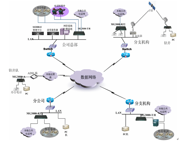 對(duì)規(guī)模比較小的辦事處,或者遠(yuǎn)端的鉆井隊(duì),一般在本地都是采用ADSL接入這樣方式,這樣情況可以直接配置MG3000-A語(yǔ)音往關(guān),實(shí)現(xiàn)語(yǔ)音數(shù)據(jù)同傳方式。MG3000-A提供1、4、8口多種方式供實(shí)際情況來選擇。所有的號(hào)碼可以直接在總部中心的平臺(tái)來分配控制。