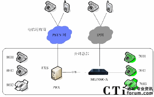 在公司總部增加一臺(tái)IPPBX(MG3000-X),通過(guò)中繼線(xiàn)與原有的PBX系統(tǒng)互聯(lián),在IPPBX上開(kāi)通分機(jī)(7XXX), 新增員工的分機(jī):