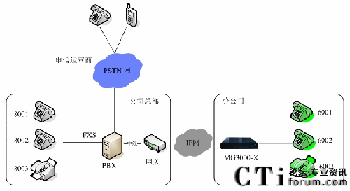 公司總部增加一臺(tái)語(yǔ)音網(wǎng)關(guān),通過(guò)中繼線(xiàn)與原有的PBX相連,異地分公司增加一臺(tái)IPPBX,下面開(kāi)通分機(jī),公司總部和分公司通過(guò)IP網(wǎng)連接在了一起。