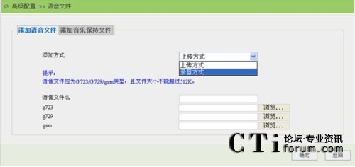 點(diǎn)擊“添加”鏈接按鈕,進(jìn)入語音文件添加頁面,用戶可以選擇上傳方式或者錄音方式來添加語音文件。如下圖所示: