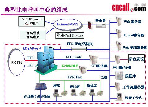 本方案使用北電Meridian 1 Option 11C交換機、配備計算機電話集成系統(tǒng)(CTI link 中間件)、交互式語音/傳真應(yīng)答系統(tǒng)(IVR/FAX)、智能路由和呼叫處理系統(tǒng)(SmartRouting)、人工座席系統(tǒng)(SmartAgent)、呼叫中心管理系統(tǒng)(CCM)、錄音監(jiān)控系統(tǒng)(CClog)、數(shù)據(jù)庫服務(wù)器、應(yīng)用服務(wù)器、網(wǎng)絡(luò)系統(tǒng)等,通過應(yīng)用網(wǎng)關(guān)與現(xiàn)有的業(yè)務(wù)應(yīng)用系統(tǒng)集成。