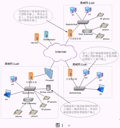 該系統(tǒng)建立在NGN基礎(chǔ)上,包括交換中心Asiasoft Gatekeeper,解決NAT、防火墻的代理軟件eProxy和視頻多點(diǎn)控制單元MCU,這些都建立在ITU制定的標(biāo)準(zhǔn)H.323協(xié)議上。一般單位和企業(yè)為便于管理和應(yīng)用,都建設(shè)了使用私有IP 地址的局域網(wǎng)(LAN),當(dāng)需要訪問外網(wǎng)時(shí)必須進(jìn)行地址轉(zhuǎn)換(NAT)。局域網(wǎng)內(nèi)的終端之間進(jìn)行呼叫和通信時(shí)沒有任何問題,但與外網(wǎng)終端進(jìn)行VoIP通信時(shí)就會(huì)有問題產(chǎn)生,原因是局域網(wǎng)中的IP地址是私有的,在Internet中不可路由。為了解決VoIP通信協(xié)議不能穿越防火墻和NAT的問題,亞軟軟件技術(shù)股份有限公司推出了eProxy代理軟件。它可以在確保網(wǎng)絡(luò)安全、不改變已有設(shè)備和網(wǎng)絡(luò)環(huán)境的情況下,為用戶實(shí)現(xiàn)實(shí)時(shí)的點(diǎn)對(duì)點(diǎn)IP語音、視頻和數(shù)據(jù)通信服務(wù)。(如圖1所示)