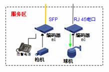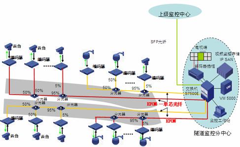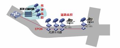 道路沿線監(jiān)控:采用EPON組網(wǎng),路況監(jiān)控球機(jī)接入前端編碼器,多個(gè)編碼器通過一根EPON光纖接入到中心交換機(jī)上,布線方便節(jié)省光纖資源。編碼器內(nèi)置交換機(jī)功能可以接入IP報(bào)警電話方便公路報(bào)警。還可以將支持IP接口的可變信號板和氣象站直接接入編碼器交換機(jī)端口,實(shí)現(xiàn)一網(wǎng)多用,降低整體網(wǎng)絡(luò)成本。