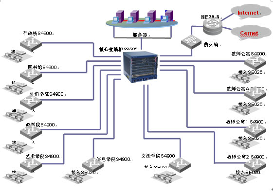 S8505萬兆核心路由交換機作為整個網(wǎng)絡的核心,以高密度、大容量的轉(zhuǎn)發(fā)性能為豐富的業(yè)務提供支持。Quidway? S8505萬兆核心路由交換機具備178Mpps的處理能力,300G的交換容量,并可以升級到600G;接入采用為教育行業(yè)定制的E026/E050交換機,實現(xiàn)整網(wǎng)的安全接入的完善的帶寬管理功能。網(wǎng)絡出口采用NE20-8第五代路由器實現(xiàn)雙出口,實現(xiàn)靈活的路由策略。
