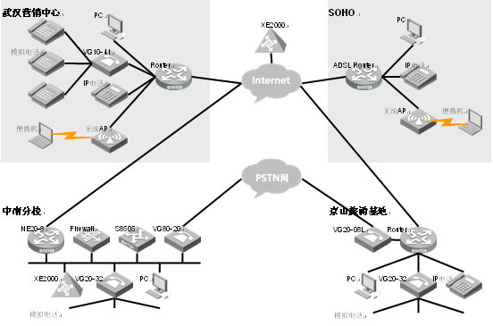 通過在公網(wǎng)部署XE2000語音服務器實現(xiàn)IP語音網(wǎng)絡向廣域網(wǎng)的擴展,實現(xiàn)IP語音無處不在,內(nèi)部電話完全免費。公網(wǎng)XE2000與中南分校局域網(wǎng)XE2000配合輕松實現(xiàn)NAT/FW穿透,無需添置任何其他設備,對已有NAT/FW設備影響小。
