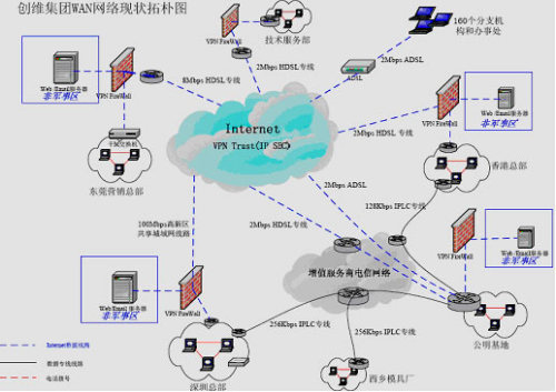 ·整個網(wǎng)絡連通性很差:隨著公司業(yè)務發(fā)展和規(guī)模擴大,現(xiàn)在整個集團除總部外還包括13個產(chǎn)業(yè)公司和全國160個分支機構,分布在以深圳為中心的全國各個地方,目前各產(chǎn)業(yè)公司之間的網(wǎng)絡連接除深圳總部、香港、公明基地和西鄉(xiāng)模具廠四地之間是通過窄帶IPLC專線連接外,其他各地均通過Internet公網(wǎng)連接,沒有構成統(tǒng)一的企業(yè)內(nèi)部網(wǎng)絡互連。