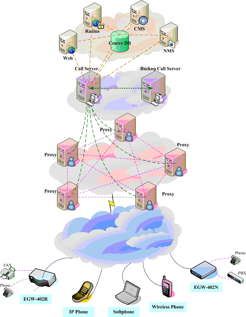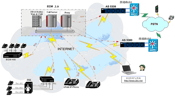 無論大型企業(yè)用戶(通過PBX接入網關設備)、小型企業(yè)用戶(使用網關設備)還是其它使用單口網關或IP Phone的用戶,都可以通過各種接入方式接入到ECM3.0網絡中,并通過PROXY及MEDIA