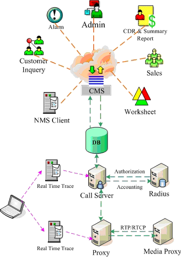系統(tǒng)管理員通過Web和CMS對用戶進行管理,并通過CS和PROXY所帶的網管功能(NMS)進行實時的網絡監(jiān)控及維護,及時診斷并處理故障。