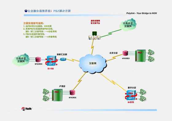 此方案實(shí)施后,用戶今后的VoIP分點(diǎn)擴(kuò)容會(huì)十分簡(jiǎn)單易行。當(dāng)用戶有新的分店時(shí),分店的通訊系統(tǒng)可以直接上一臺(tái)Polylink eTalk® IA系列i PBX,它既有與PBX相同而且更多的各種功能,還具有VOIP網(wǎng)關(guān)的功能,可直接與總部的IX系統(tǒng)互相注冊(cè),既省掉了多添置一臺(tái)語音網(wǎng)關(guān)的成本,也避免了設(shè)備的重復(fù)堆壘。