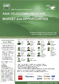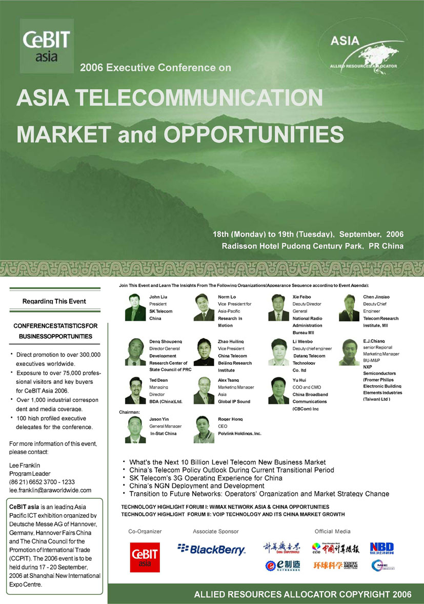 2006亞洲信息及通信技術(shù)展覽會(huì),即亞洲CeBIT展將于今年9月17日至20日在上海新國際博覽中心召開。由中國國際貿(mào)促會(huì)電子信息行業(yè)分會(huì)與德國漢諾威展覽公司聯(lián)合主辦的這一展會(huì),近300家國內(nèi)外廠商參展,將分為數(shù)字設(shè)備及系統(tǒng)、商務(wù)應(yīng)用、通信三大展區(qū),多方位展現(xiàn)ICT行業(yè)的最新趨勢,并成為業(yè)內(nèi)廠商的專業(yè)貿(mào)易平臺。本次CeBIT展會(huì)期間(9月18、19日兩天),將在浦東證大麗笙酒店召開“2006亞洲通信及信息市場管理層論壇”。包括中國國家信息產(chǎn)業(yè)部、中國電信、韓國SK電訊、BDA中國等多家政府機(jī)關(guān)、運(yùn)營商、制造商將參加本次論壇,并做重要發(fā)言。