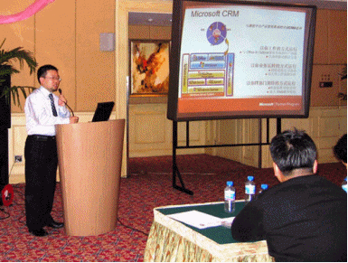 微軟公司負(fù)責(zé)天津地區(qū)的夏玉玲小姐在簡短的開幕式后首先發(fā)表演講,介紹了微軟為商業(yè)應(yīng)用開發(fā)的各種商務(wù)解決方案(MBS)。其后通用咨詢公司總經(jīng)理鄭明先生上臺(tái)演說,其演講主題將營銷管理理論體系與微軟CRM密切結(jié)合,博得了與會(huì)者贊同的掌聲。