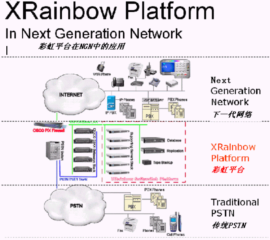 Xrainbow軟交換平臺它是基于SIP協(xié)議、針對中國現(xiàn)有Internet網(wǎng)絡(luò)狀況和現(xiàn)有網(wǎng)路硬件服務(wù)商的VoIP 設(shè)備的特點,為電信運(yùn)營商和二級/虛擬運(yùn)營商, 通信系統(tǒng)集成商提供運(yùn)營于下一代新網(wǎng)絡(luò)(NGN, Next Generation Network)之上的一套集VoIP 語音及信號交換、管理及服務(wù)于一體的電信級系統(tǒng)平臺。X彩虹SIP軟交換系統(tǒng)包括以下的核心服務(wù)器如下認(rèn)證服務(wù)器、路由服務(wù)器、配置服務(wù)器、功能服務(wù)器、語音郵件服務(wù)器、媒體轉(zhuǎn)發(fā)服務(wù)器和網(wǎng)絡(luò)管理服務(wù)器。我們的系統(tǒng)可以實現(xiàn)多種功能,功能模塊包括:監(jiān)控模塊、計費(fèi)模塊、管理模塊、話吧模塊、代理商模塊、軟電話模塊、集團(tuán)功能模塊、電話卡模塊、主叫認(rèn)證模塊、回?fù)苣K、批發(fā)計費(fèi)模塊、電話會議模塊等。